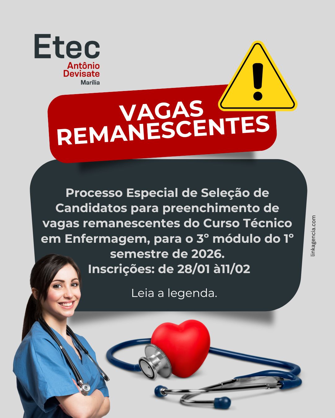 Atenção, você que quer estudar na Etec Antônio Devisate, temos vagas remanescentes para o Curso Técnico em Enfermagem, para o 3º Módulo, no 1º Semestre de 2026.