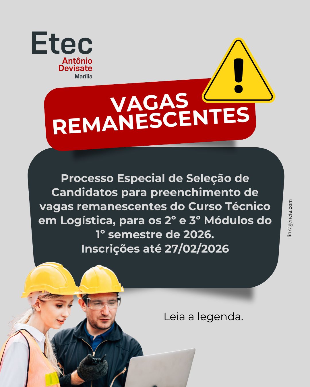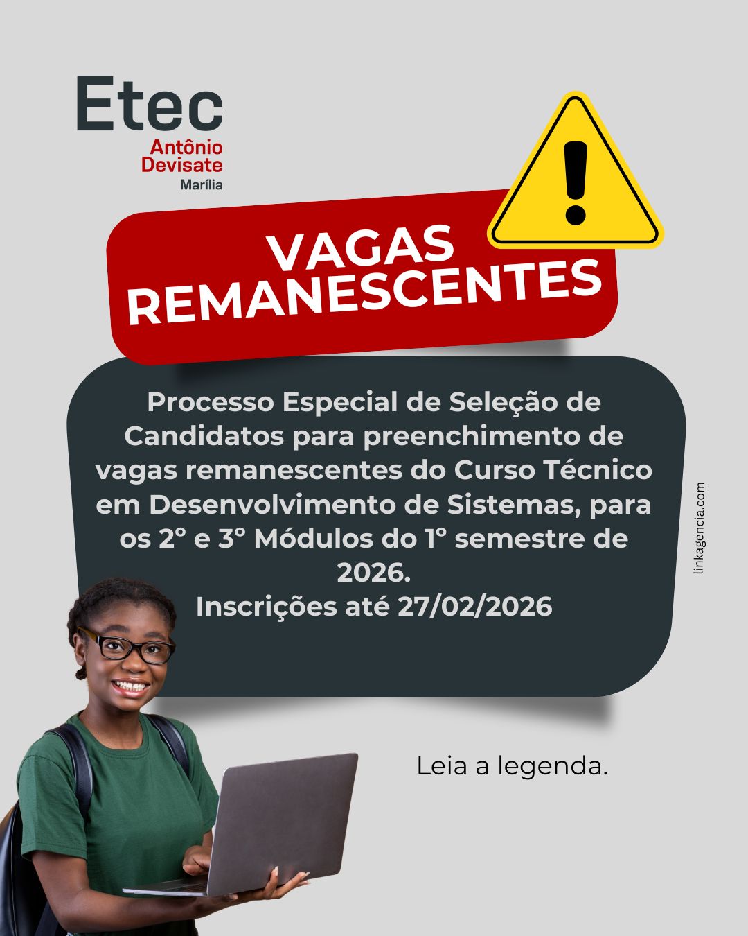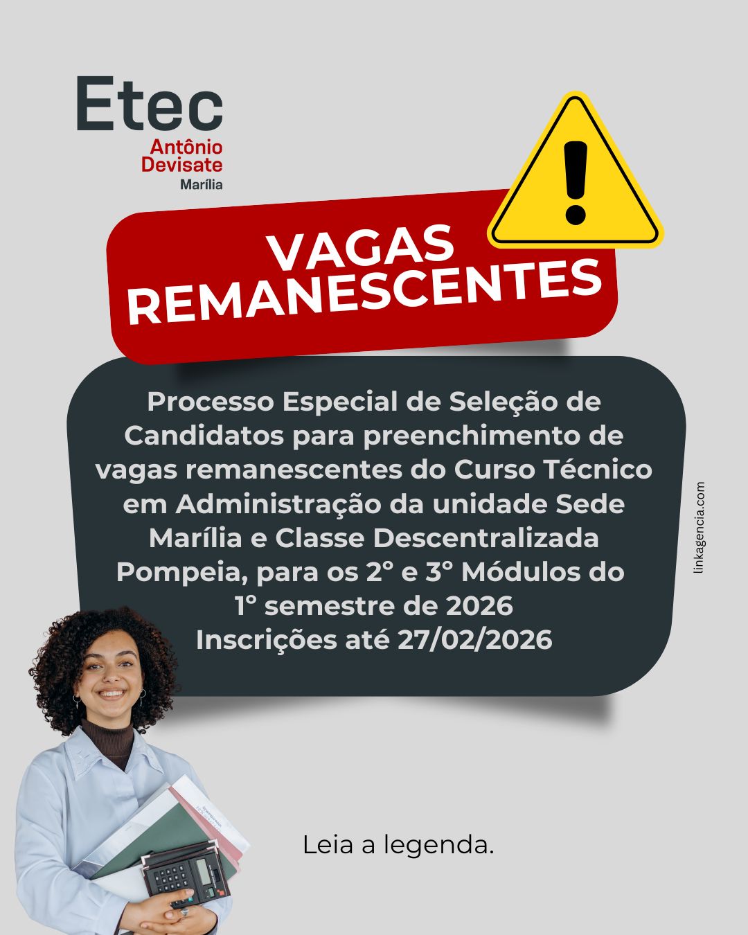 Atenção, você que quer estudar na Etec Antônio Devisate, temos vagas remanescentes para os Cursos Técnicos em Administração da unidade Sede Marília e Classe Descentralizada Pompeia, para Desenvolvimento de Sistemas, Logística e Segurança do Trabalho, para os 2º e 3º Módulos do 1º semestre de 2026.